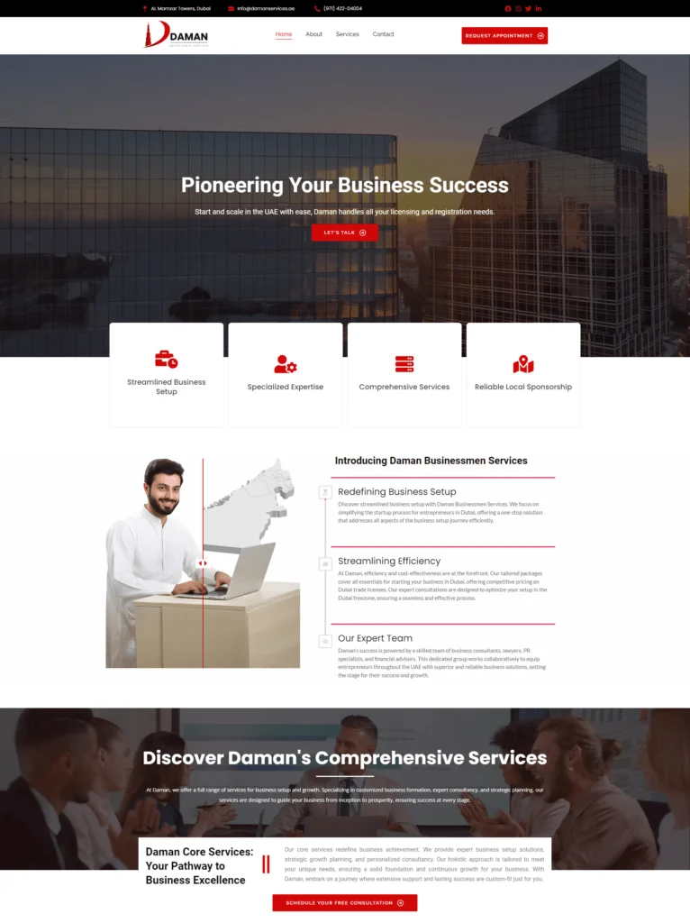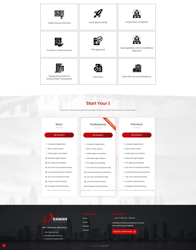 Tasked with developing a dynamic and user-friendly website for Daman Pro Services, a leading provider of professional services in Dubai, NexScaleX aimed to create a digital platform that not only showcases the company’s comprehensive range of services but also enhances user engagement and drives business growth.